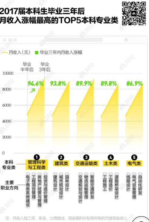 還有建筑、交通運輸、土木類專業(yè)等,它們雖然大多屬于傳統(tǒng)行業(yè),起薪低,普遍不如熱門的互聯(lián)網行業(yè)高,但好在收入增幅快、年終獎多。